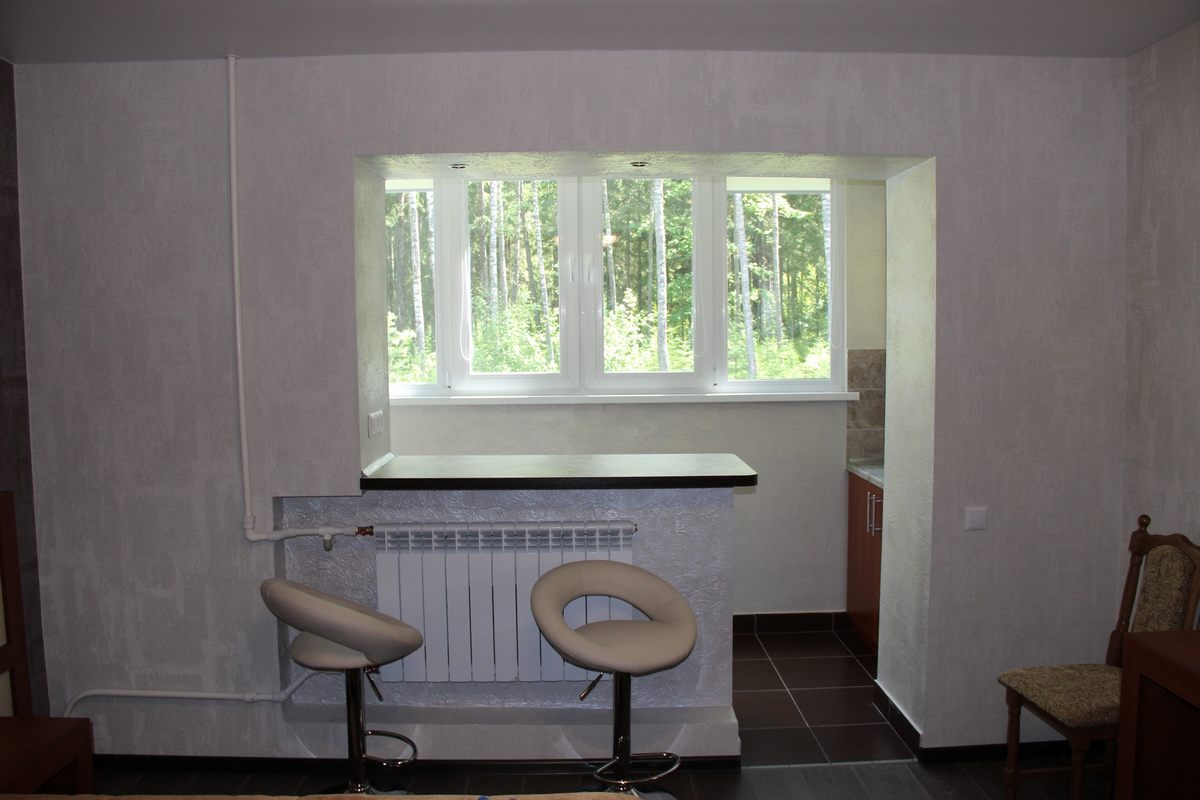 В номере: двуспальная кровать, прикроватные тумбы, стол, стулья, шкаф, тахта, телевизор, холодильник, электрочайник, утюг с гладильной доской, сушилка для белья, набор посуды