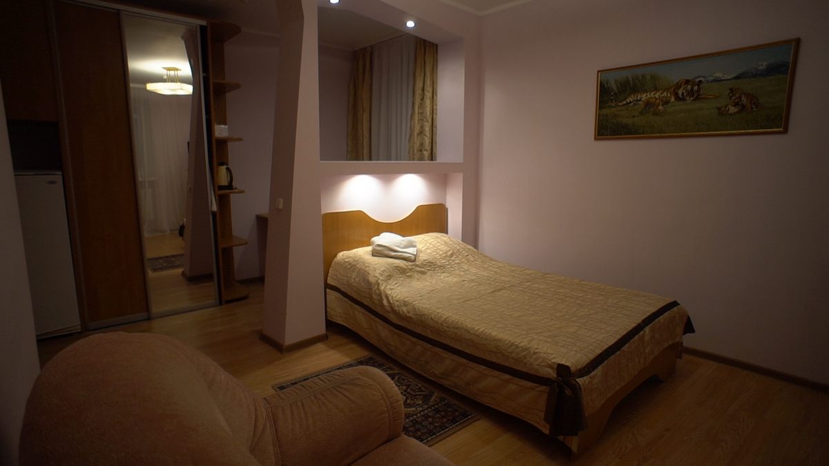 В номере: двуспальная кровать, прикроватные тумбы, стол, стулья, шкаф, тахта, телевизор, холодильник, электрочайник, утюг с гладильной доской, сушилка для белья, набор посуды